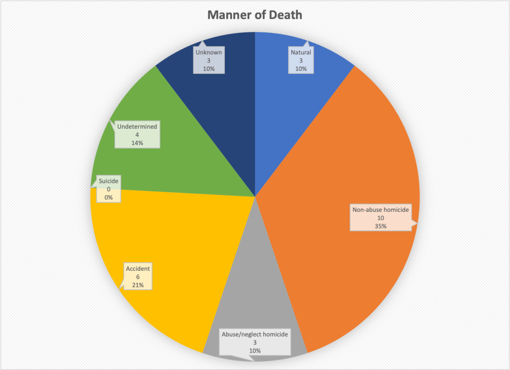 The manners of death* of the 40 children whose cases are included in the body of the report are displayed in the pie chart below. Half of these children were victims of “non-abuse homicide;” nine (or 22 percent) died of natural causes; five (or 12 percent) died in accidents; three (or seven percent) died because of abuse or neglect; and one died by suicide. The other two children’s manners of death were “undetermined” and “unknown.” While children who die from abuse and neglect after having previous contact with child welfare draw the most public concern, research shows that children who have prior contact with child welfare also tend to die more often from all causes than children with no such involvement, as I discussed in my post, Report of maltreatment: a major risk factor for child mortality.